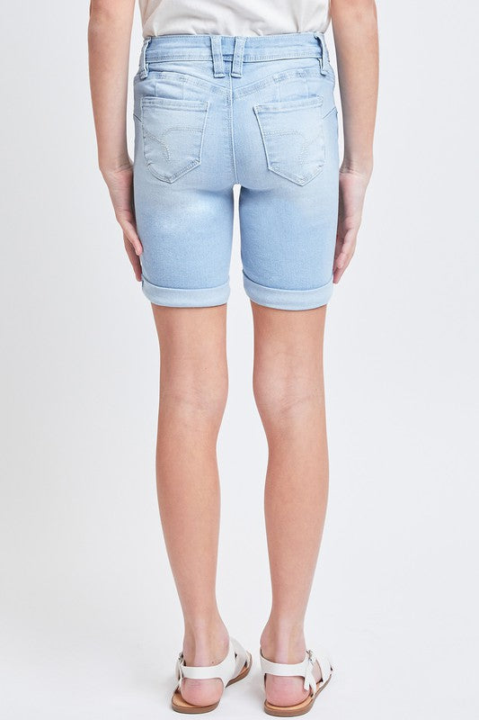 This classic Denim Bermuda Short is great for any occasion. Features include a mid-rise fit with 1-button closure and zipper, 5 pocket construction, light distressing, and cuffed hems. The tailored shape and signature heart-shaped stitching ensure an excellent fit and superb comfort. Size 10 inseam is 4" with 8.5" rise and 15" leg opening.