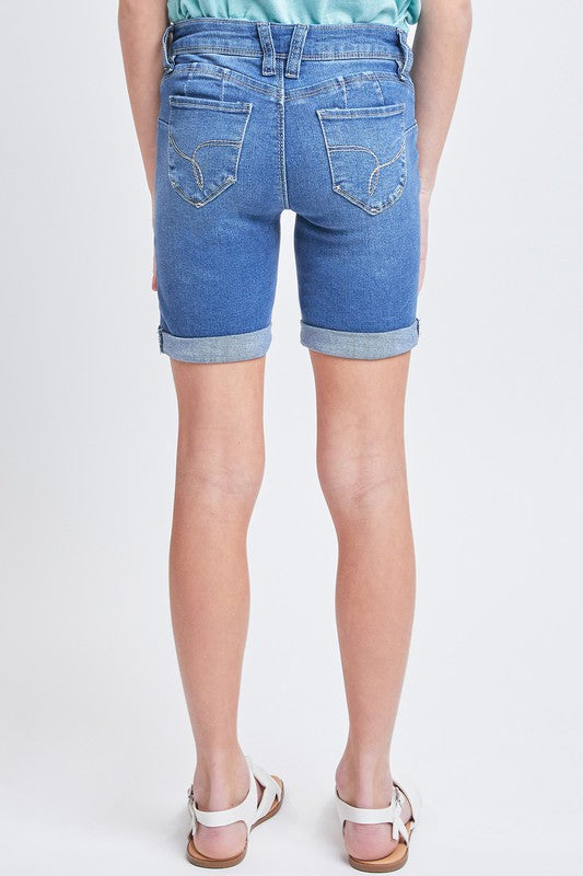 This classic Denim Bermuda Short is great for any occasion. Features include a mid-rise fit with 1-button closure and zipper, 5 pocket construction, light distressing, and cuffed hems. The tailored shape and signature heart-shaped stitching ensure an excellent fit and superb comfort. Size 10 inseam is 4" with 8.5" rise and 15" leg opening.
