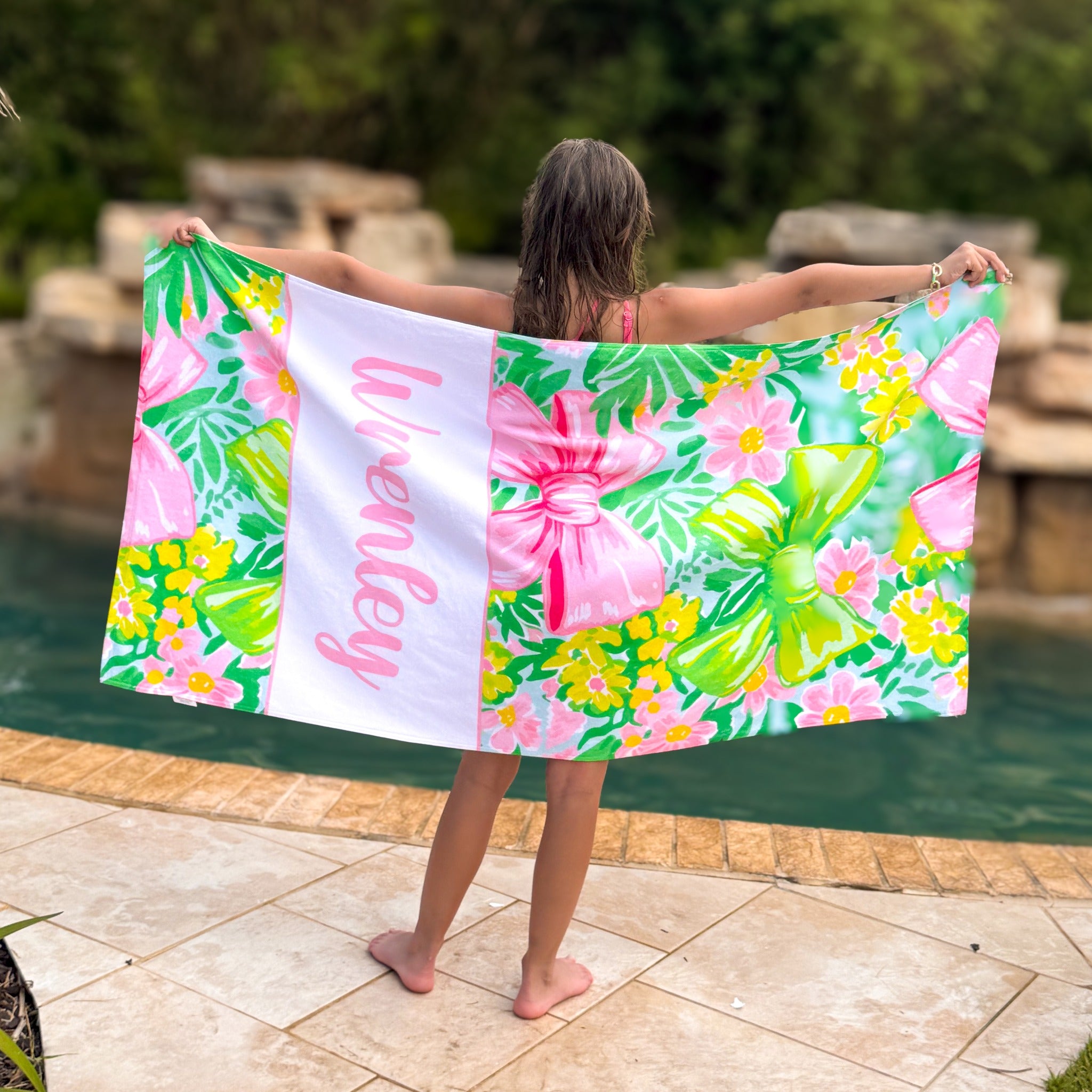 Enjoy some fun in the sun with our Pink Bow Personalized Beach Towel! Measuring 30x60, this towel is perfect for pool time, vacations, and girls' trips. Personalize it with a name for an extra special touch. It's the perfect gift for anyone who loves to lounge in style!